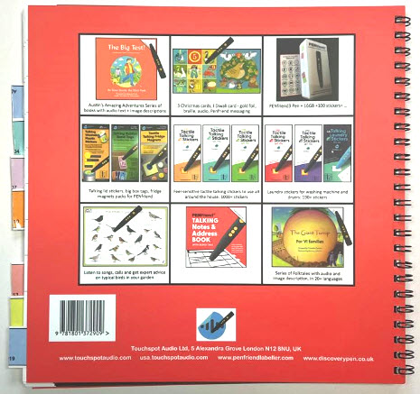 The PENfriend Notes and Address Book is a 64-page spiral-bound book that allows you to create custom tabs, unlike a traditional address book with A to Z tabs. You can label sections with titles like "Emergencies," "Family," "Recipes," "Reminders" etc. Each page has four sections for audio recordings, allowing a total of 252 entries. The uncoated paper lets you write with pencil, and Page 1 serves as an index for easy navigation. With 16GB of memory, it can store over 250 hours of recordings. You can also decide how many pages each section should have.